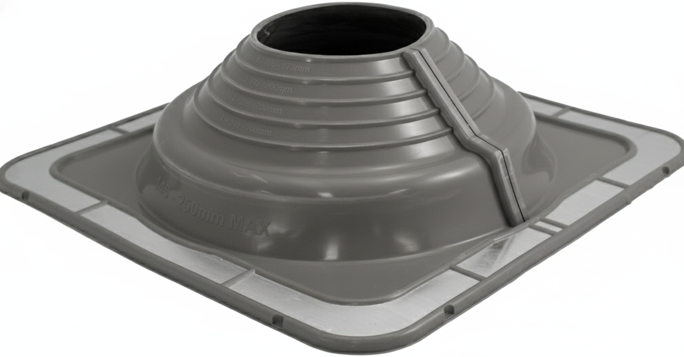 When the flue type is a twin or triple skin, tests have shown that the Aquarius black EPDM pipe flashing will adequately do the job and should not be affected by the passive flue heat.